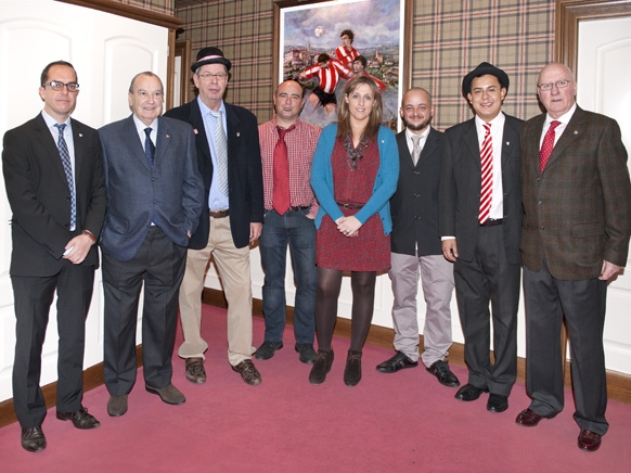 El personal comienza a llegar y su presidente Salva Acha les da la bienvenida. Se reparten los típicos "bombines" entre los presentes.