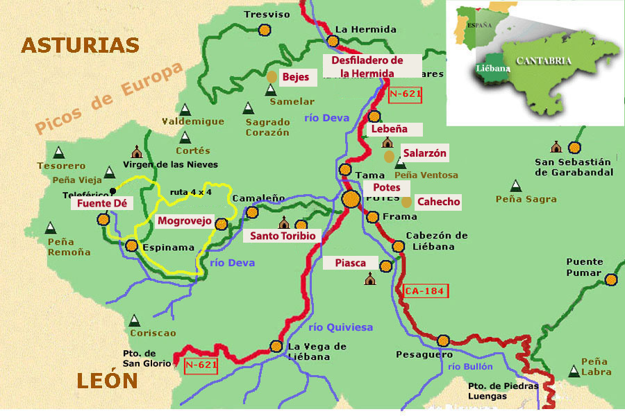 De esta zona de La Liebana visitamos: El Desfiladero de la Hermida y Santa María de Lebeña, Bejes, Potes, Monasterio de Santo Toribio, Iglesia en Piasca , Cahecho, Mogrovejo y Fuente Dé