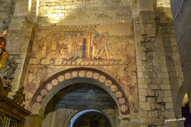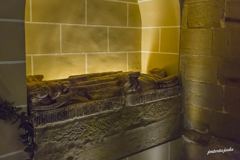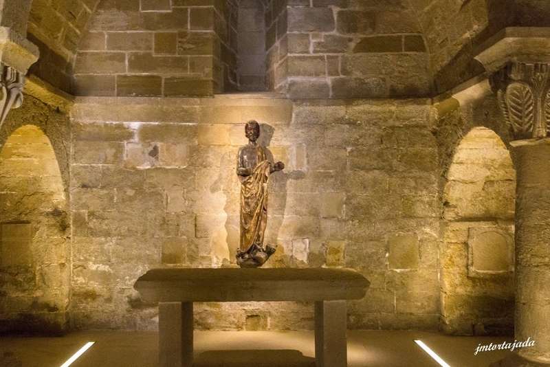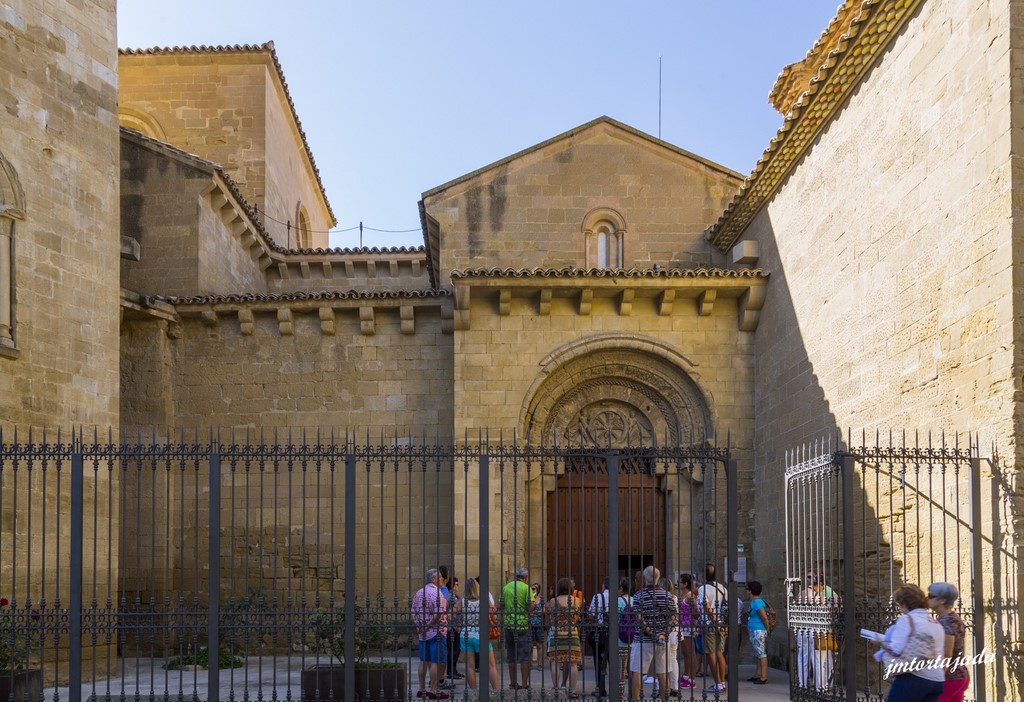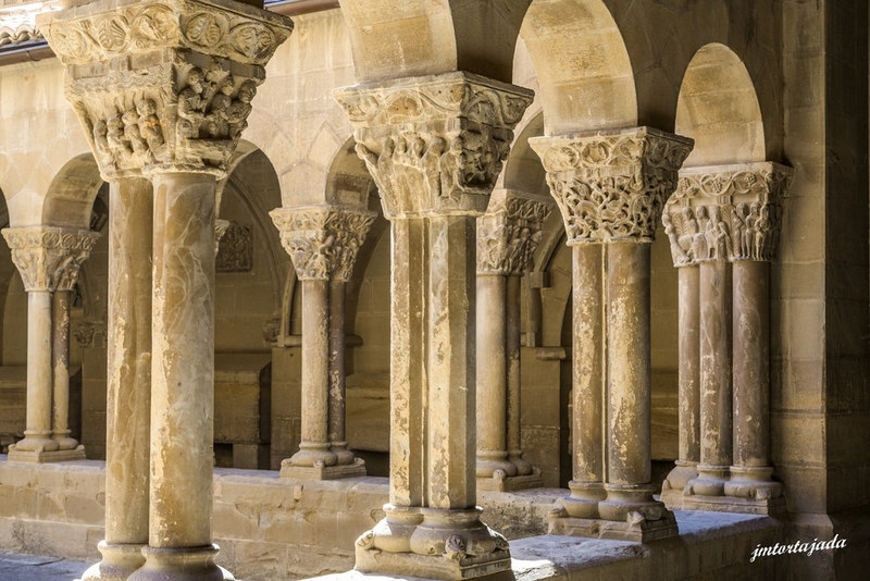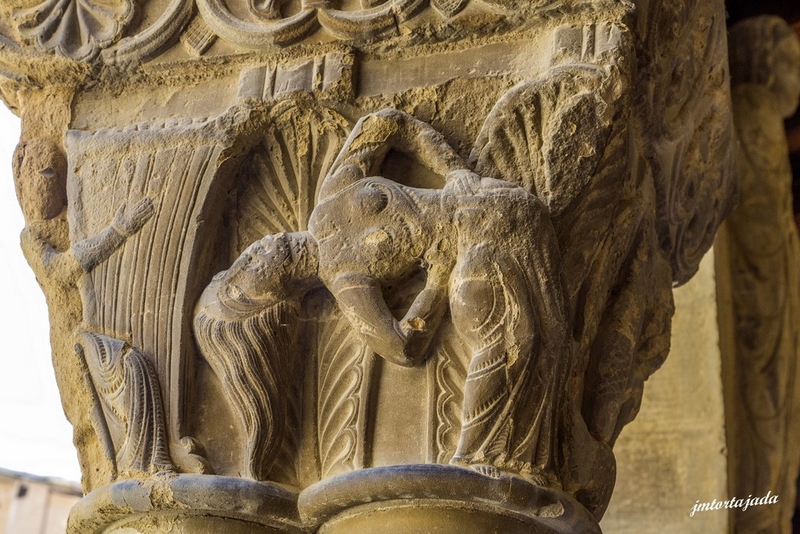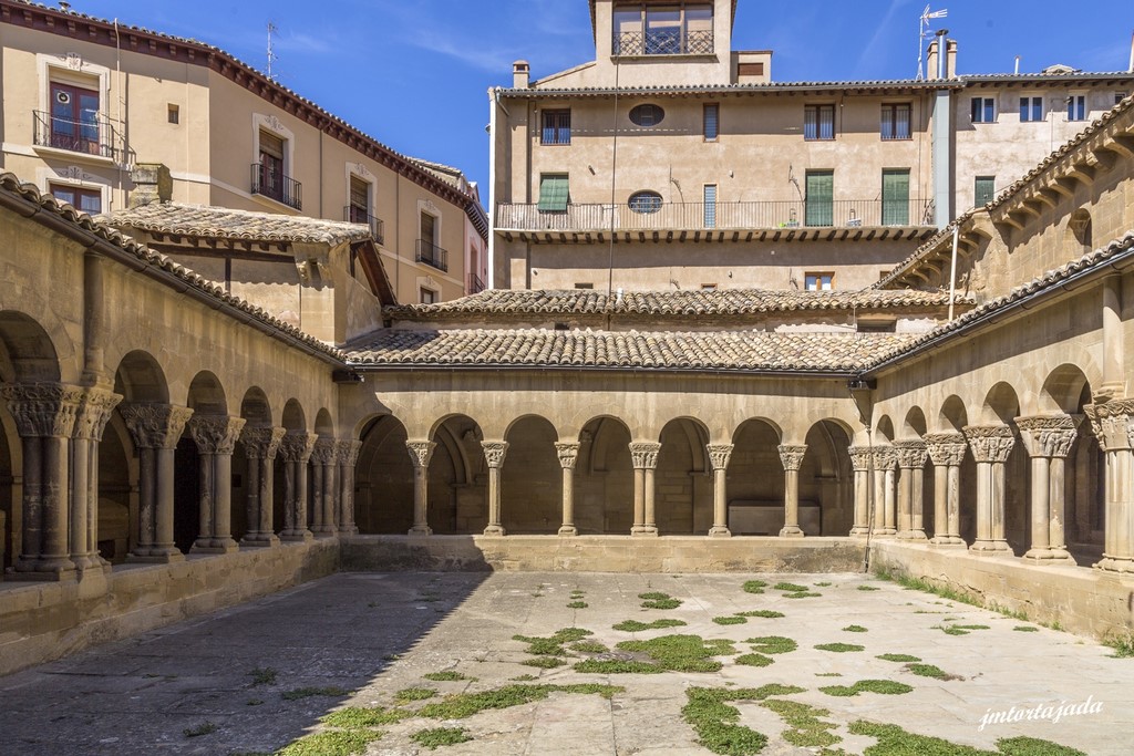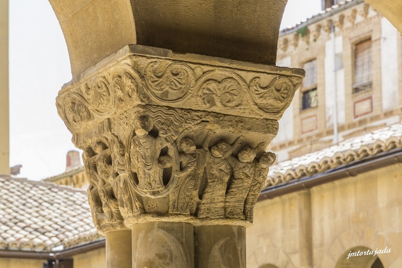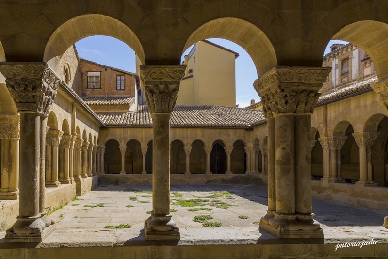 Destaca el claustro, que pertenece al denominado románico europeo, es obra del anónimo escultor llamado Maestro de San Juan de la Peña. La estructura es simple: un rectángulo que presenta cuatro crujías. Sobre un banco corrido se levantan columnas pareadas que sostienen un capital único, hasta completar un total de 38 con temas referentes a la vida de Jesús, escenas del Antiguo Testamento, vicios, pecados y toma de la ciudad.