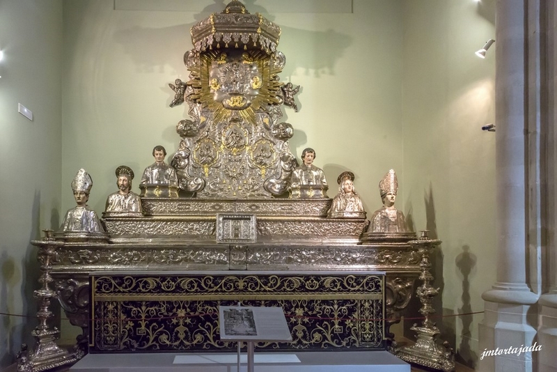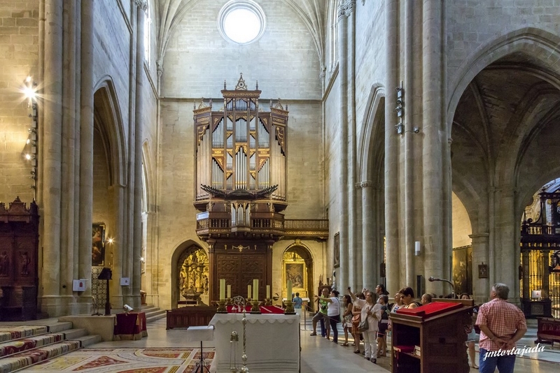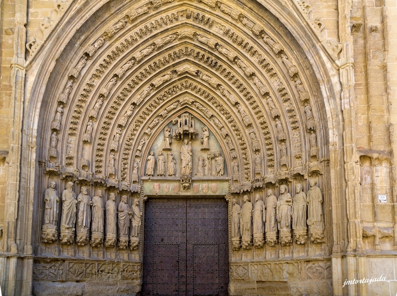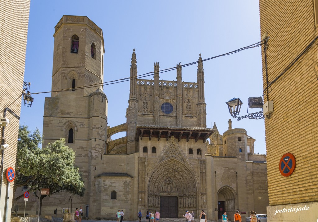 LA CATEDRAL y EL MUSEO DIOCESANOLa portada de la Catedral es un conjunto destacado de escultura gótica, de autor desconocido. Está compuesta por siete arquivoltas que albergan las estatuas de dieciséis mártires, catorce Vírgenes, diez ángeles y ocho profetas. El Tímpano está presidido por una imagen de la Virgen con el Niño y a sus dos lados los Reyes Magos y a Cristo resucitado con María Magdalena. En las jambas hay catorce imágenes: once apóstoles, San Juan Bautista, San Lorenzo con la parrilla y San Vicente (patrones locales estos dos últimos). En el centro del dintel, hay tres escudos: el escudo medieval de Huesca, en el que figura la muralla; el de Aragón, con las barras rojas sobre fondo amarillo; y el escudo de la familia Azlor. además de la portada principal el edificio cuenta con dos puertas menores: una gótica y otra románica.