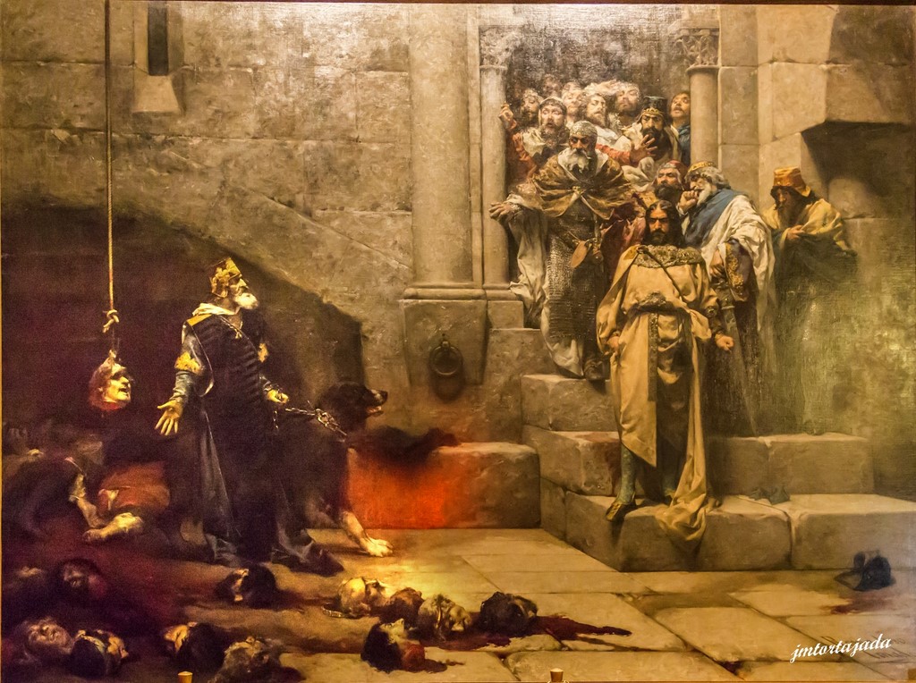 En el Patio encontramos una techumbre de madera, que se repite en El Salón del Justicia, donde se alberga el lienzo de Casado del Alisal, “La Campana de Huesca”, de 1880. Este episodio en el que se mezclan la historia y la leyenda cuenta que cuando Ramiro II el monje llegó a ser rey de Aragón (a la muerte de su hermano Alfonso I el Batallador sin descendencia) tuvo que enfrentarse a algunos nobles levantiscos, que querían aprovecharse de la debilidad del nuevo rey, sin ninguna experiencia de gobierno. Se cuenta que el rey los convocó en una sala del palacio real de Huesca (actualmente dentro del Museo de Huesca) diciéndoles que tenía pensado hacer una campana que se oyese en todo el reino. ¿Qué hizo? Pues cortarles la cabeza a medida que iban entrando.