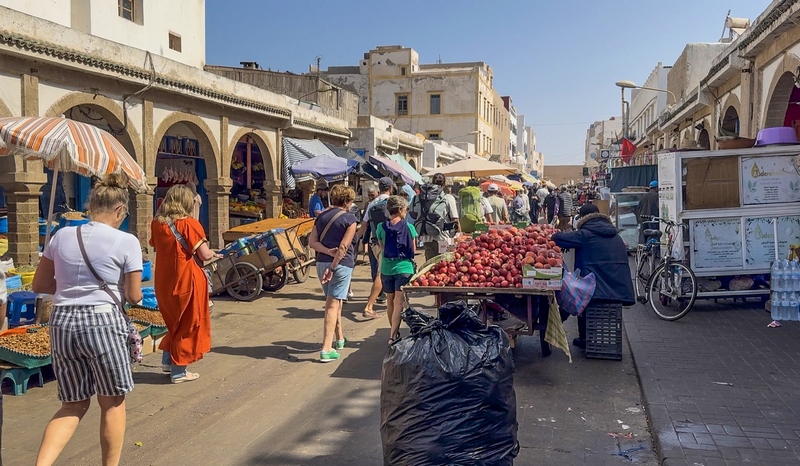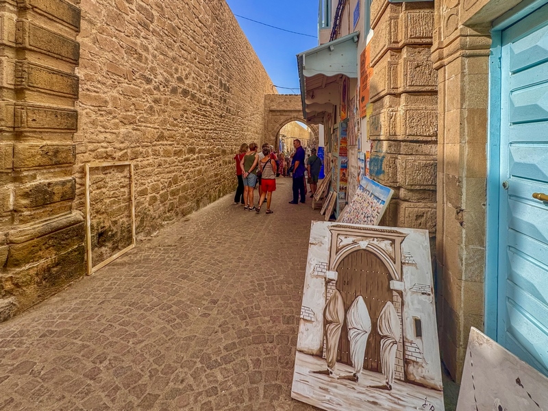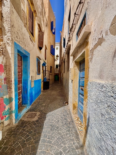 La medina de Essaouira está rodeada por completo por murallas defensivas que fueron construidas por los portugueses que llegaron a estas tierras en el siglo XV. Desde la orilla del mar, las viejas murallas rodeando la ciudad son una de las imágenes más fotogénicas de Marruecos. Caminamos hacia la plaza Moulay Hassan. Se entra en un ambiente animado en el que todo el mundo está ocupado con sus quehaceres. No hay vehículos motorizados, todo es transportado en carretas tiradas por mulas. Lo que más destaca al visitante son la blancura de las paredes de las casas y el azul de las ventanas y puertas, que evocan a las islas del Mediterráneo.