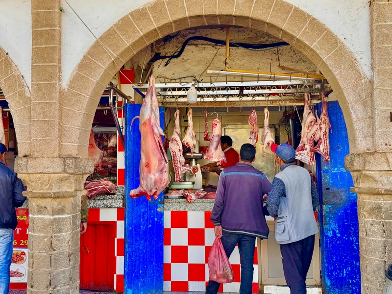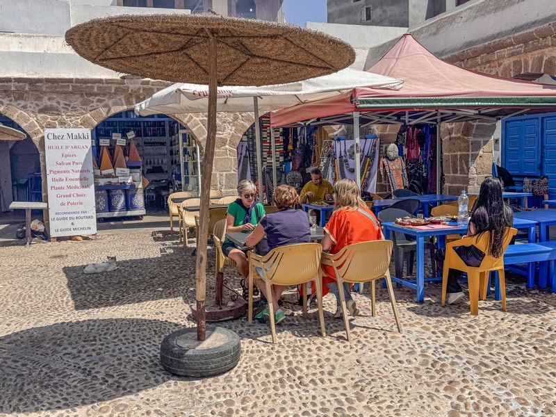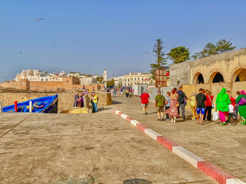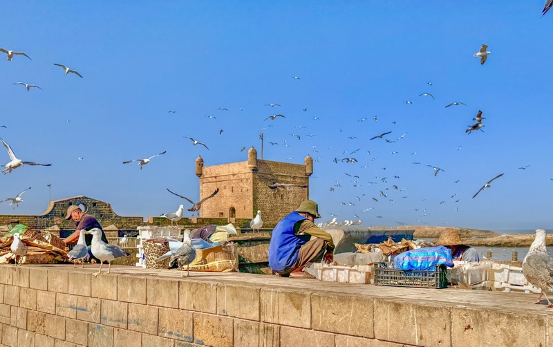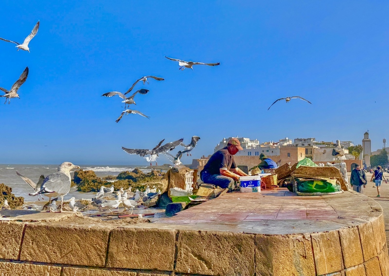 Vemos barquitos azules por todas partes, redes colgando, pescadores arreglando sus aparejos y gaviotas intentando robar algún pez despistado. Es como un pequeño mundo dentro de Essaouira. Vemos cómo es la vida local de verdad.