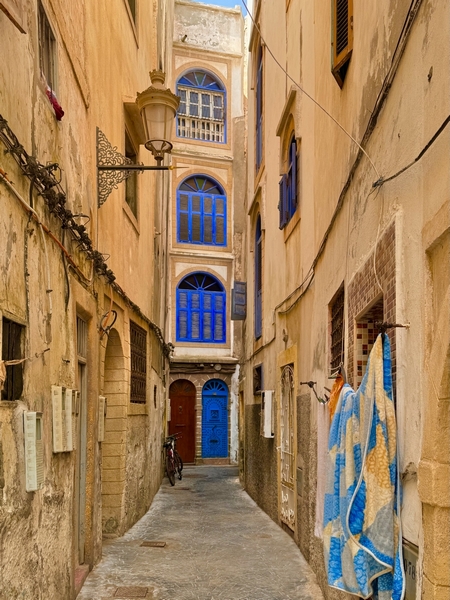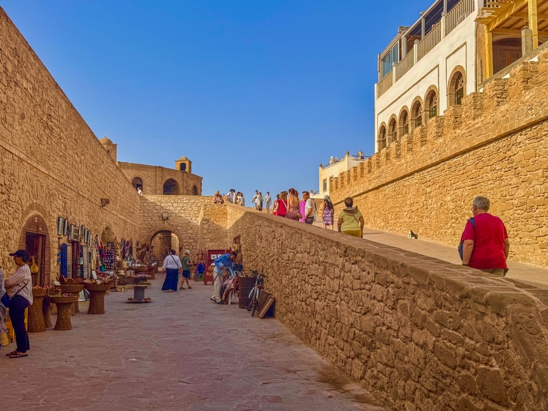 La medina de Essaouira está rodeada por completo de murallas que fueron construidas por los portugueses y fue declarada Patrimonio de la Humanidad por la UNESCO en 2001. Una vez dentro de las murallas, lo mejor es perderse, recorrer sin rumbo las serpenteantes calles, fijarse en las desconchadas paredes y puertas de madera azul y observar el ir y venir de los habitantes de la ciudad.