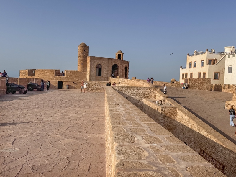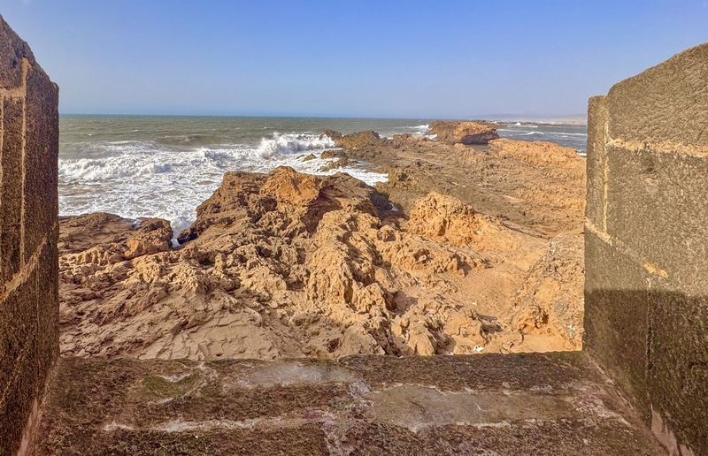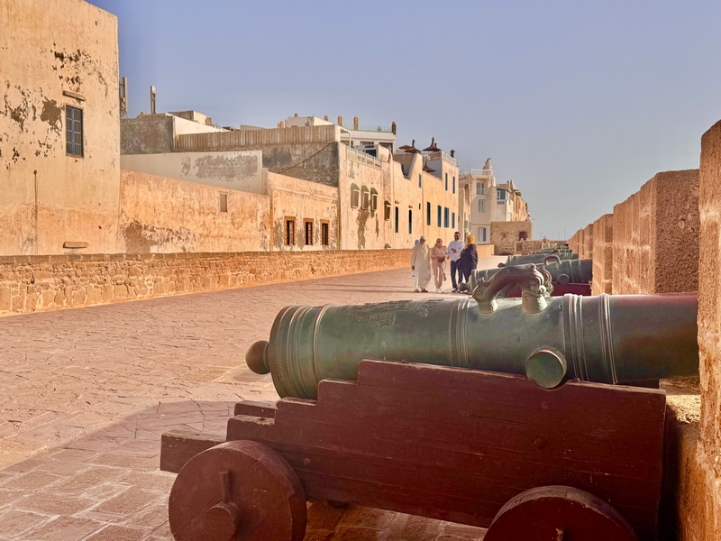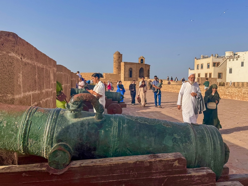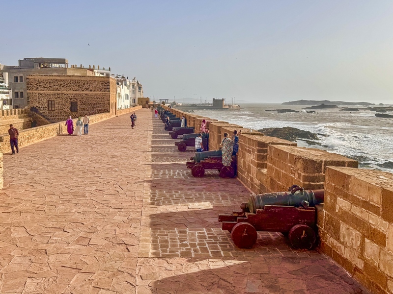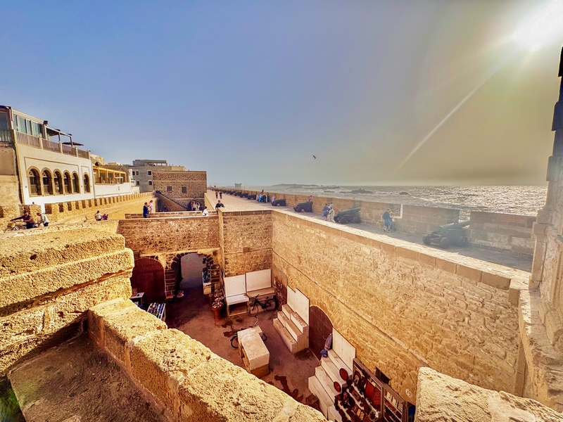 Tras traspasar un arco de piedra y subir una amplia rampa, llegamos al baluarte sobre el mar Skala de la Kasbah, que nos da acceso a la pasarela de las murallas de Essaouira, uno de sus puntos más interesantes y escenario de la película de Juego de Tronos
