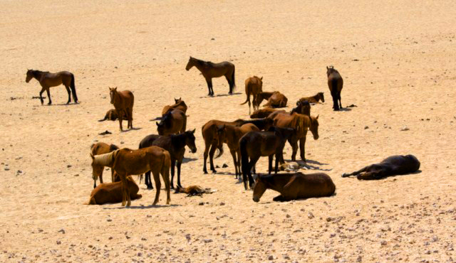 LÜDERITZ Nos ponemos en marcha con destino a la ciudad de Lüderitz. Tras varias horas de carretera llegamos a una zona de espacio abierto de tonos ocres donde se encuentran probablemente los únicos caballos salvajes del mundo que galopan libres por un desierto. Los pudimos ver en el Waterhole (poza de agua) de Gabud, mantenida especialmente para ellos.
