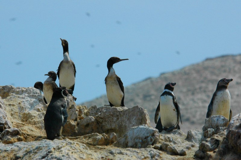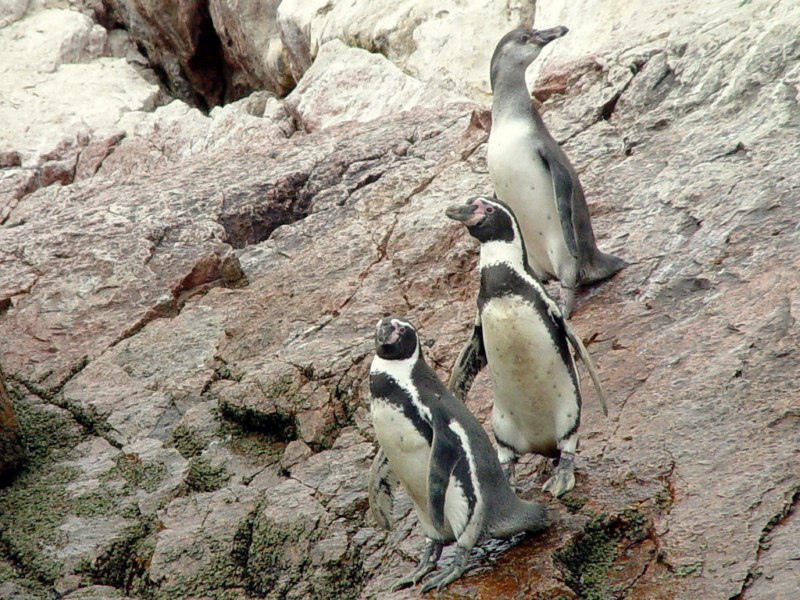 Se puede apreciar el pingüino de Humboldt que se encuentran en peligro de extinción, debido a amenazas naturales como el fenómeno del niño y también por reducción de sus zonas de anidación, captura y consumo, pesca con dinamita y uso como mascota. Otro nombre que se les da a estos pingüinos de Humboldt, es Pájaro Niño. Estos pingüinos comen anchoveta y pejerrey y viven hasta 20 años. Cuando pensamos en pingüinos rápidamente los asociamos con el frió de la Antártida. El pingüino de Humboldt es la única especie de pingüino en el Perú. Vive en las costas desérticas de Perú y Chile. Pasa la mayor parte de su vida en el mar, en la corriente peruana de Humboldt.
