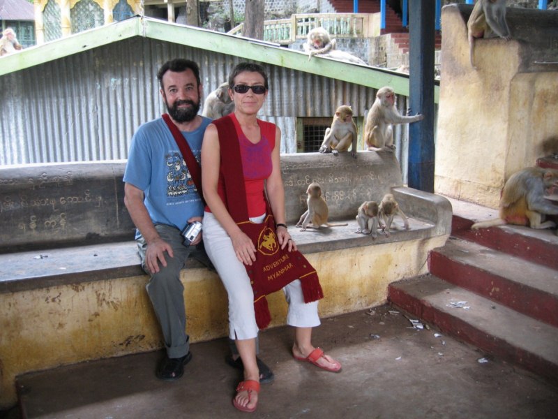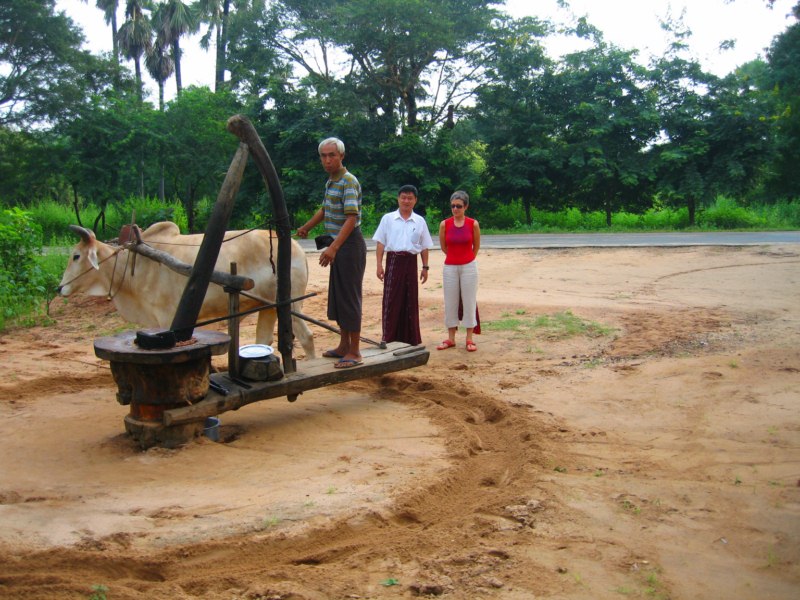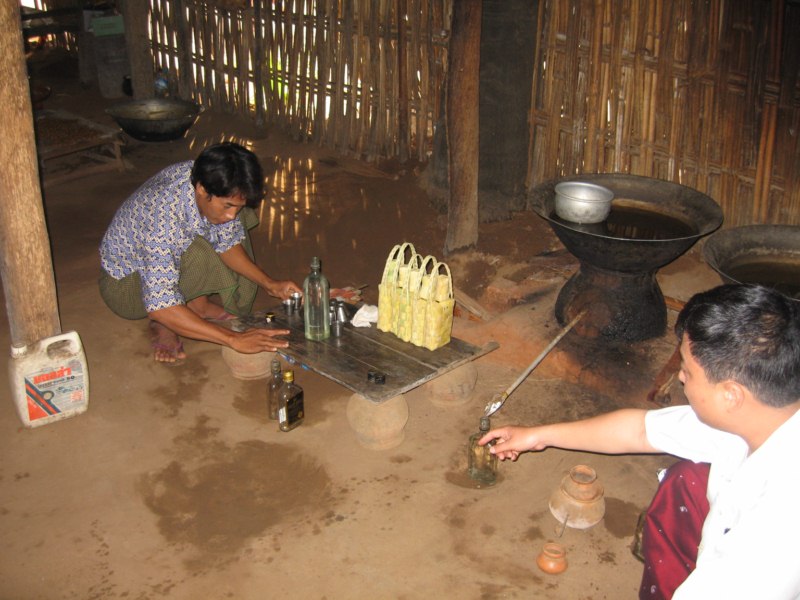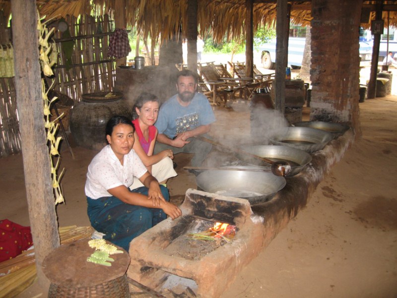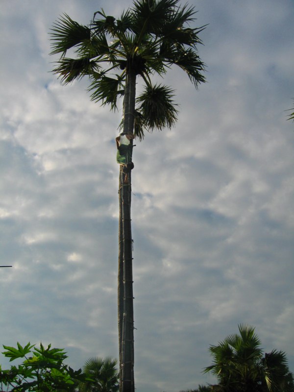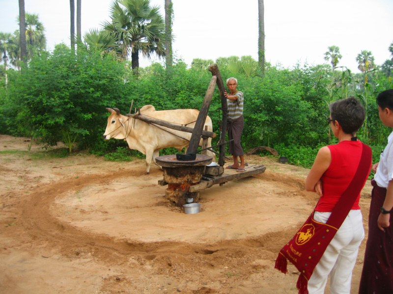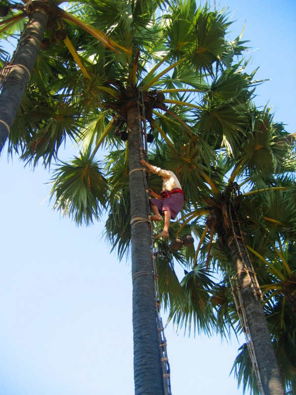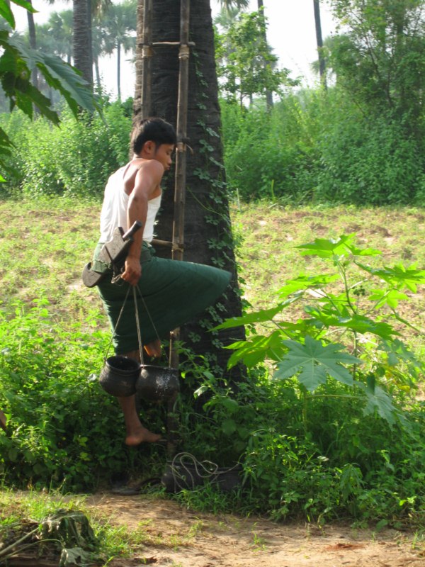 Tras desayunar en el hotel tomamos el coche para visitar la ciudad de Salay y a continuación iremos al Monte Popa. Durante el camino parada en medio del campo para ver una industria de palma. Nos enseñan el molino para hacer aceite, que es una piedra cónica que gira arrastrada por un cebú, como en las norias. Nos hacen una demostración de trepa a la palma para sangrar los frutos. Luego destilan el jugo fermentado y consiguen un aguardiente, que llaman vino de palma. Nos invitan a té, cacahuetes y aguardiente. También nos enseñan la pasta que hacen frotando los troncos jóvenes para untarse contra el sol, aunque yo creo que más bien es una forma de decoración. Tras muchas risas y sonrisas nos regalan unas cestitas con productos típicos. Trepa a la palma