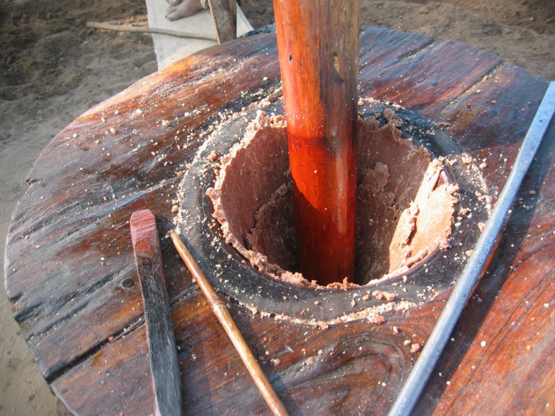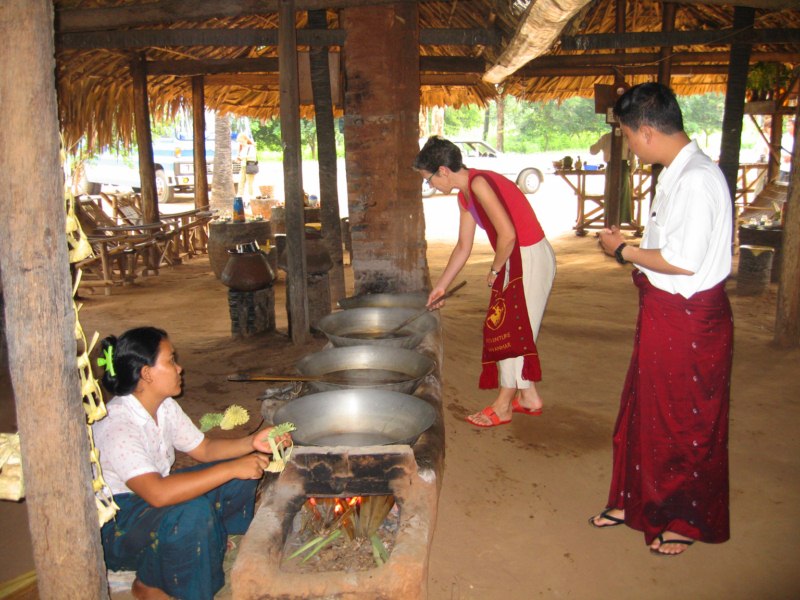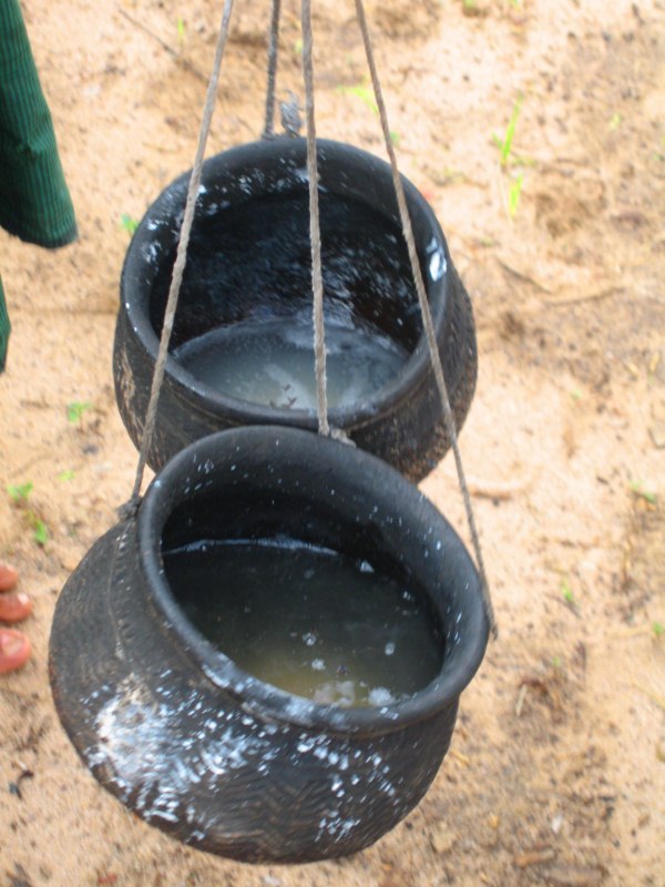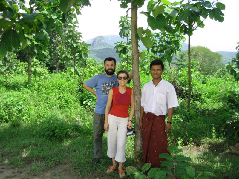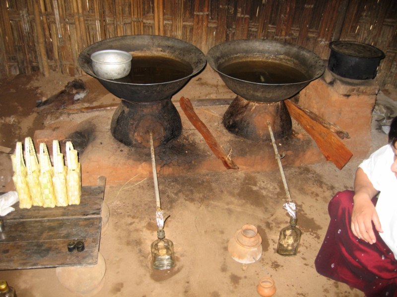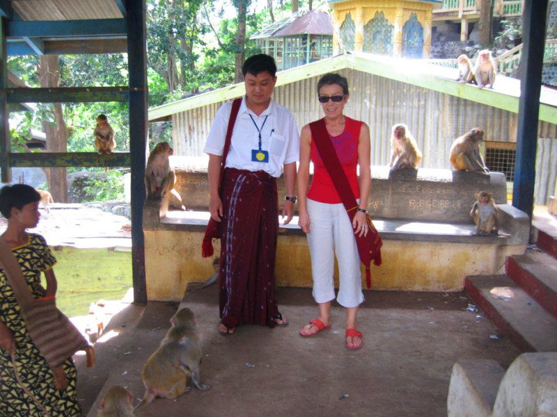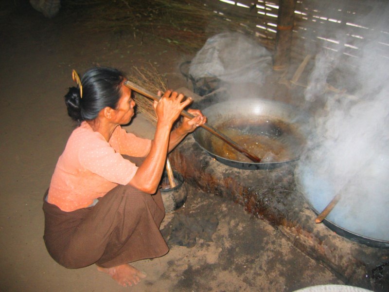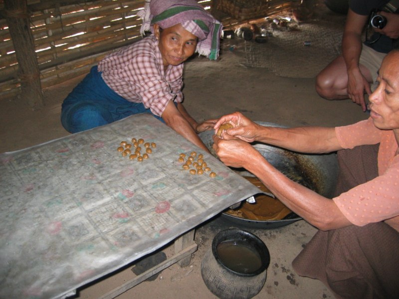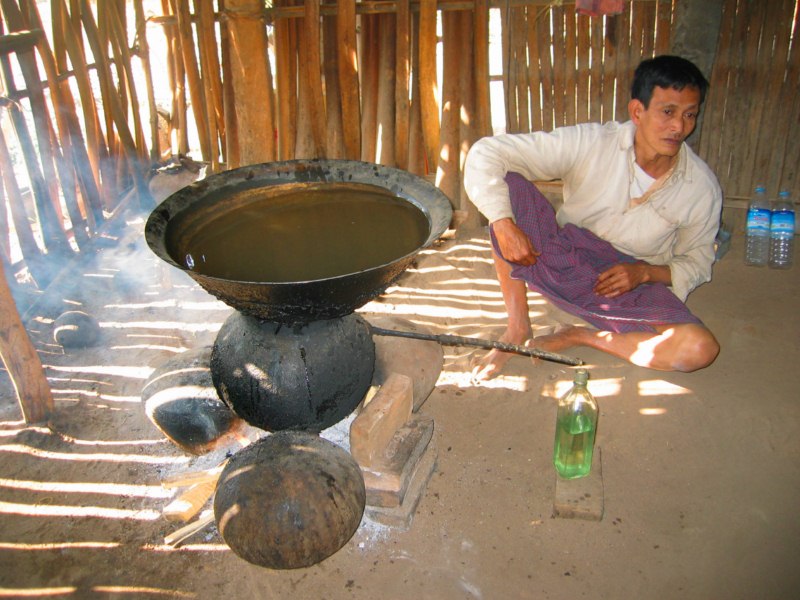 Tras desayunar en el hotel tomamos el coche para visitar la ciudad de Salay y a continuación iremos al Monte Popa. Durante el camino parada en medio del campo para ver una industria de palma. Nos enseñan el molino para hacer aceite, que es una piedra cónica que gira arrastrada por un cebú, como en las norias. Nos hacen una demostración de trepa a la palma para sangrar los frutos. Luego destilan el jugo fermentado y consiguen un aguardiente, que llaman vino de palma. Nos invitan a té, cacahuetes y aguardiente. También nos enseñan la pasta que hacen frotando los troncos jóvenes para untarse contra el sol, aunque yo creo que más bien es una forma de decoración. Tras muchas risas y sonrisas nos regalan unas cestitas con productos típicos. Trepa a la palma