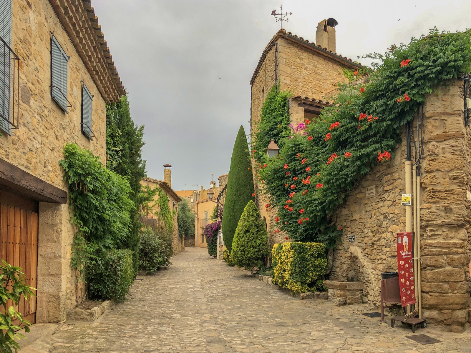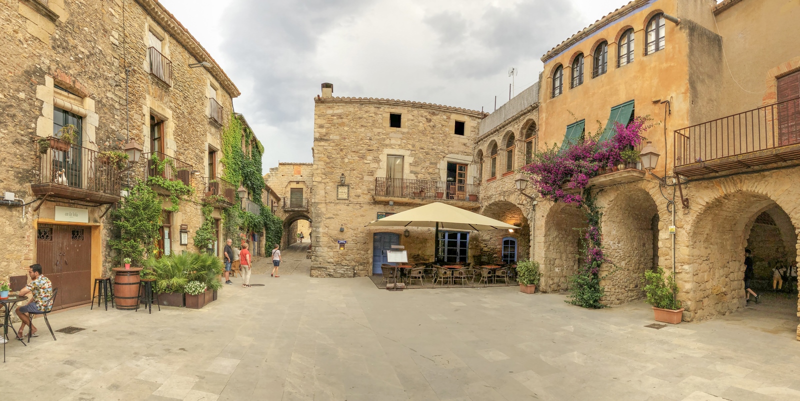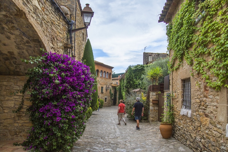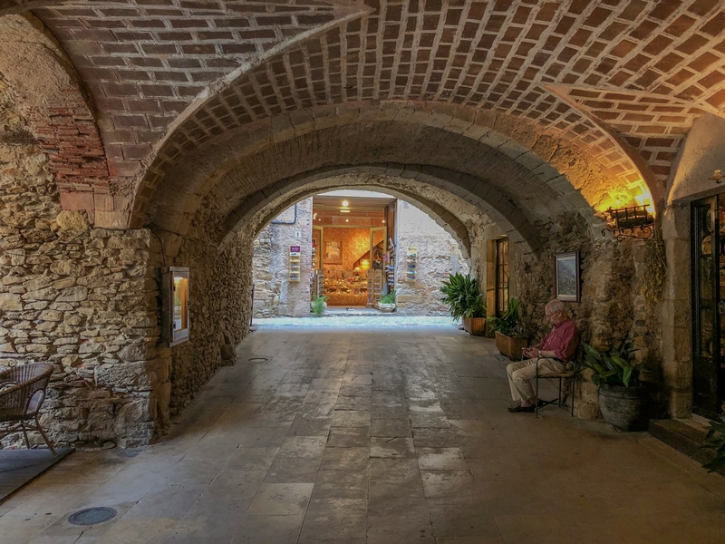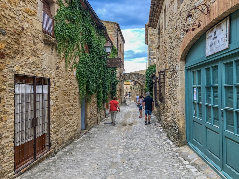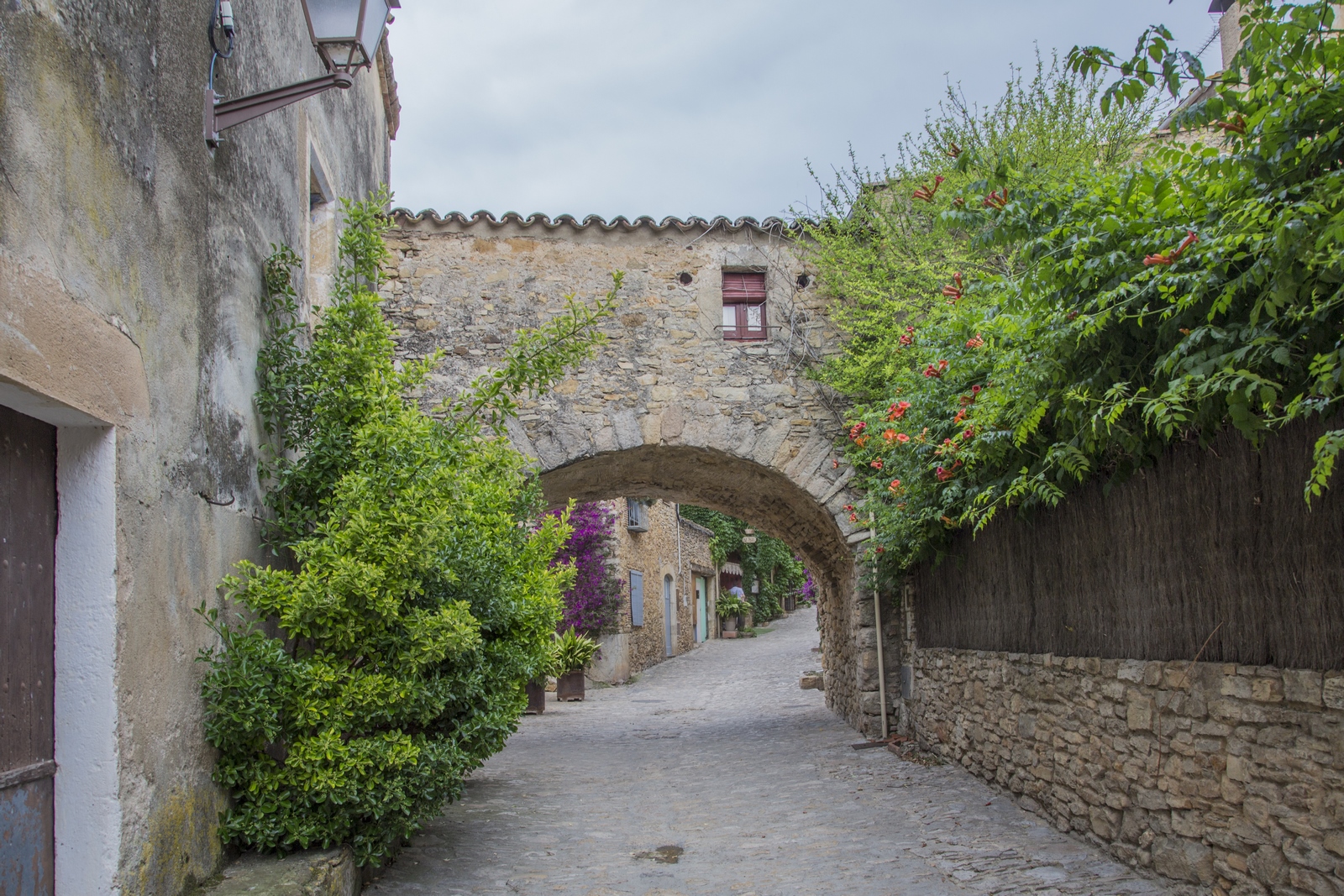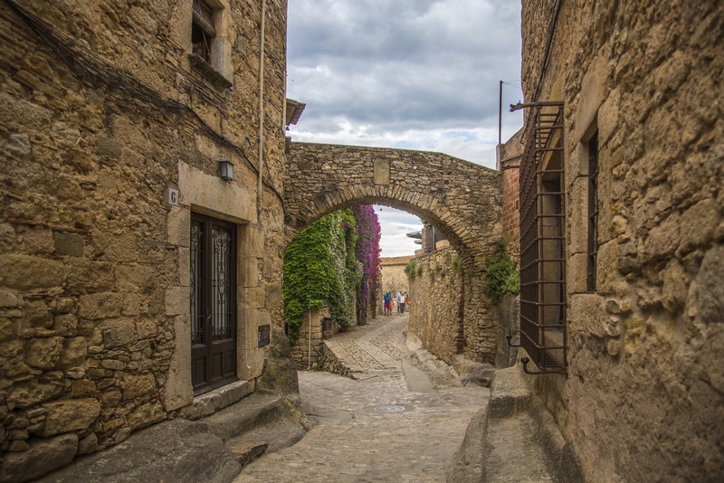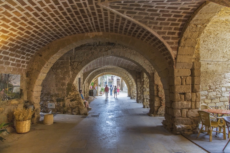 bonitos. Calle de la RocaUna vez crucéis el portal estaréis en la calle de La Roca. El punto en el que confluye con la calle Hospital es el famoso arco que podéis ver en la foto ; sin duda, un icono que ver en Peratallada. Y es que a través de ese arco se ve la fachada del restaurante el Pati, totalmente cubierta por una enredadera y buganvillas moradas (si vais en la época de floración).