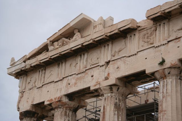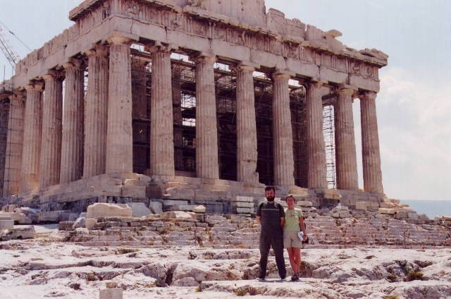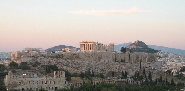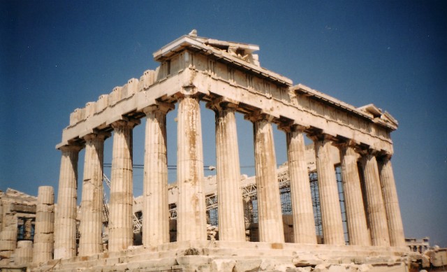 Sobre una leve colina podrán contemplar el famoso Partenón, el Erection que era el templo más sagrado de la antigüedad, el templo de Atenea-Nike, los Propileos, el Odeón de Herodes Atico, el antiguo teatro de Dionissos, etc... Todo ello dentro de este recinto arqueológico con una única entrada. Además pueden visitar el pequeño pero interesantísimo museo de la Acrópolis del que destacamos la escultura del Moscóforo y una de las auténticas Cariátides (columnas con forma de mujer), etc... EL Partenón: Es el mas bello templo del arte dórico que se conserva hoy día. Fidias dirigió su construcción entre los anos 477 y 432 a.C. Tiene ocho columnas dóricas de mármol en cada fachada y otras 16 en los laterales. En el friso del entablamento figuraban las 92 metopas que describían la guerra de Troya y las luchas contra las amazonas y los centauros. La estatua de Atenea Partenos, de oro y marfil y quince metros de altura, fue llevada a Constantinopla y posteriormente destruida. En 1687, los turcos instalaron en la Acrópolis un polvorín que destruyó parcialmente el Partenón.