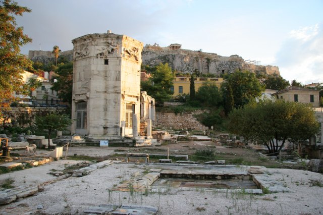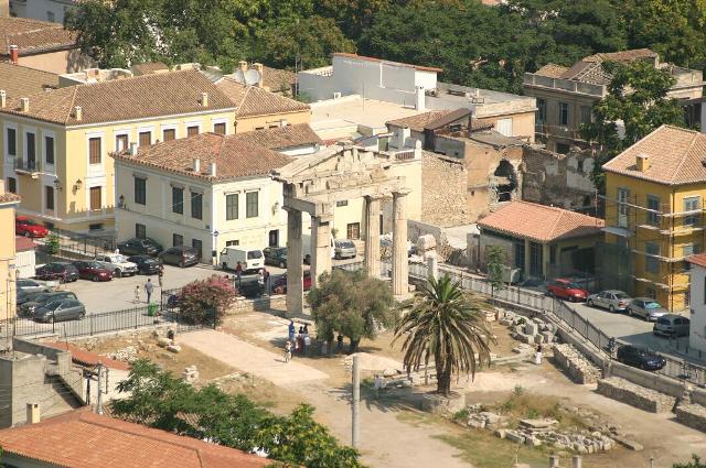 Saliendo de esta zona y muy cerca se encuentra el Ágora Romana en medio del barrio de Plaka. El Ágora romana fue construida al final de la época helenística, en el s. I aC. Con unas dimensiones de 82 por 57 m., se levanta al oeste un propileo monumental y al este otro y un pórtico de la época de Adriano. La galería del fondo estaba ocupada por tiendas. La puerta oeste, llamada de Atenea Arcegetis con propileo, se construyó a finales del s. I a. C. El monumento más notable del Ágora romana, es el reloj hidráulico de Andrónico en forma de torre octogonal de 12,10 m. de altura, con la representación de los símbolos de los vientos. La puerta de Adriano, reconstruida en el s. II, fue levantada en honor del fundador de la nueva Atenas. La Biblioteca de Adriano presenta dos exedras en la parte N y S, los pórticos del patio central y una piscina sobre la que se asienta una iglesia bizantina.