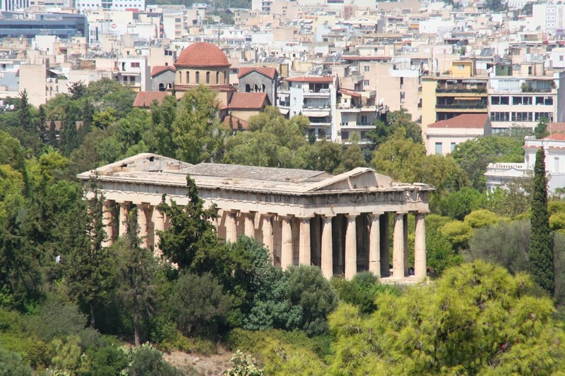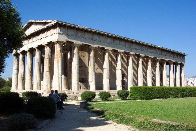 El Hefestión: Es un templo de mármol, situado en el ágora de Atenas. Es a veces llamado el Teseion (griego: Θησείο, theseio), debido a una creencia corriente en la época bizantina de que los huesos del legendario héroe griego Teseo fueron enterrados allí; a decir verdad, los presuntos huesos de Teseo fueron enterrados en el siglo V adC en otro sitio cercano de la Acrópolis. No se ha hallado ningún resto de un edificio anterior, y no se trata, por tanto, de una reconstrucción posterior a las destrucciones persas efectuadas en Atenas durante las guerras médicas. En general, el edificio es identificado como el Hefestión, donde se rendía culto a Hefesto y a Atenea. Esta identificación se funda en dos testimonios, en el de Pausanias y en el de Harpocración. Se trata de uno de los templos mejor conservados, debido en parte al hecho de que Atenas no se encuentra en una zona de terremotos frecuentes