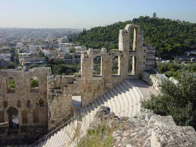 Odeón de Herodes Ático: El recinto, del siglo II d.C., está reservado a espectáculos teatrales. Puede verse desde la subida a la Acrópolis.