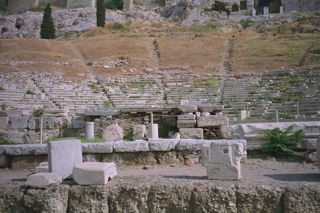 Teatro de Dionisos: En la ladera sur de la Acrópolis, tenia cabida para 16.000 espectadores. En las gradas se pueden ver los asientos de mármol de los grandes personajes, y en la escena, un pórtico con columnas y relieves en la base. Abre de 8.30 a 14.30 h.
