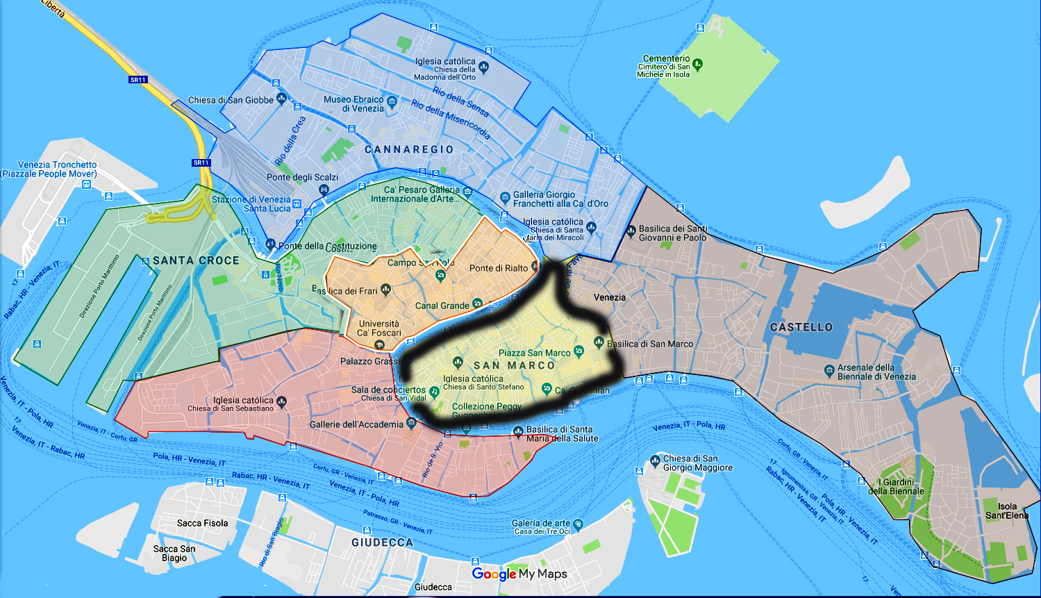 El Barrio (sestiere) de San Marco está ubicado en la zona sudeste de la ciudad de Venecia. Es el sestiere más pequeño y antiguo de los seis que hay, pero seguramente es el más valioso porque conforma el núcleo de la ciudad. Los más hermosos edificios de Venecia, y probablemente del mundo, se encuentran en él. Está comunicado por la arteria principal de la laguna: el Gran Canal. Con el vaporetto podemos llegar y entrar al barrio por su puerta grande, la Plaza San Marco, lugar de fundación de la ciudad. Actualmente es el objetivo prioritario de todo visitante. Podemos encontrar una alta concentración de lugares de interés para nuestra visita. La Basílica de San Marco, el Campanile, la Torre dell’Orollogio, el Palacio Ducal, los famosos cafés más antiguos de la ciudad, las columnas de San Marco y San Teodoro, entre otros. Pero saliendo de allí, podemos hallar lugares secretos como la bella Escala del Bovolo, el Gran Teatro La Fenice o la iglesia de Santa María del Giglio.
