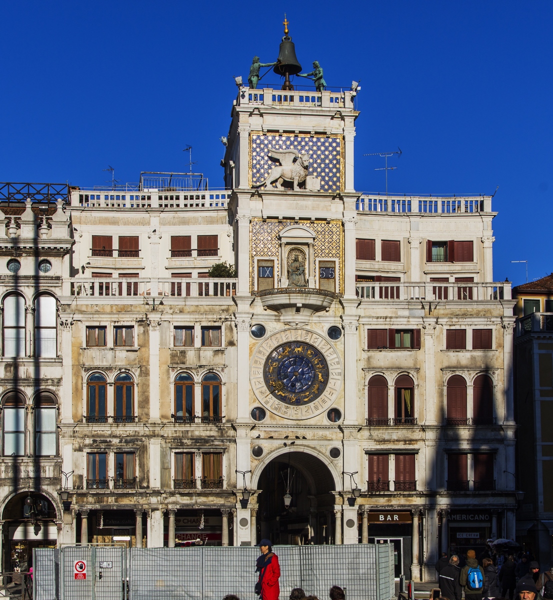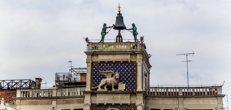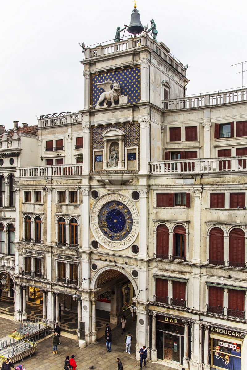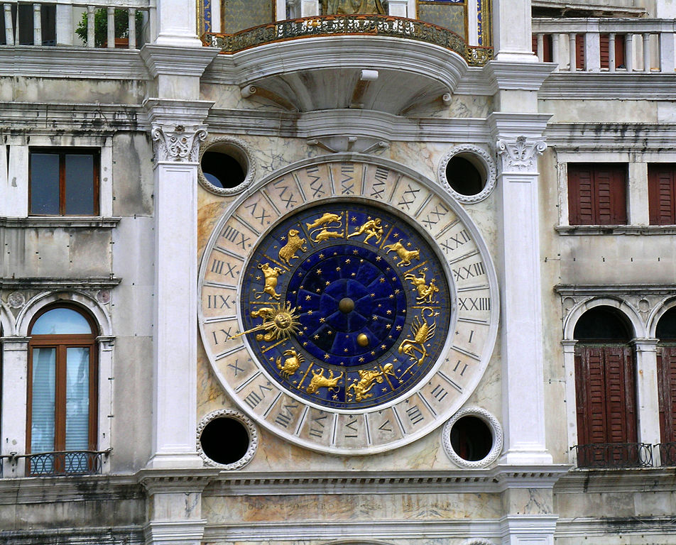 El reloj astronómico de Plaza de San Marcos consta de una gran esfera azul con los símbolos del zodíaco. En lo alto del reloj encontramos el león alado, símbolo de Venecia. Las horas en punto las tocan dos figuritas de bronce. La mejor vista del reloj astronómico es la que se puede ver desde la azotea de la basílica de San Marcos.
