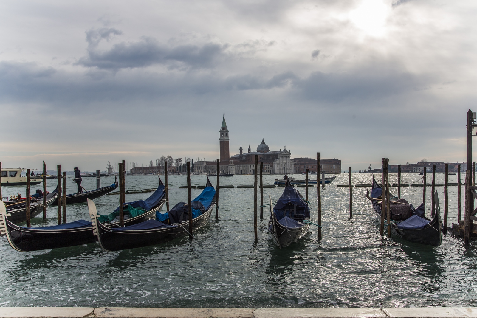 Cuando desde la Plaza de San Marcos nos dirigimos hacia la orilla de la laguna de Venecia, entramos en la plaza colindante, conocida como la Piazzetta. Al fondo, nos llaman la atención dos enormes columnas de granito, las conocidas como columnas de San Marcos y San Teodoro. Situadas en ese emplazamiento en el siglo XII, fueron traidas originariamente desde Constantinopla. Son fáciles de identificar pues sobre sus capiteles de estilo veneto-bizantino se situán dos esculturas totalmente diferentes. Vista desde la Basílica de San Marcos, a la izquierda está la Columna de San Marcos, con el León Alado de San Marcos, cuya pieza de bronce se remonta a entre el siglo IV ó V. El León Alado lo veremos en diferentes esculturas de monumentos de la ciudad, pues es el símbolo de Venecia. A la derecha se encuentra la Columna de San Teodoro, con una escultura de mármol que representa a dicho santo en lo alto de la misma. Estamos ante el Patrón de la ciudad de Venecia. Eso sí, la escultura de la columna es una copia de la original que se encuentra en el patio del vecino Palacio Ducal. Cuando paseamos por entre las columnas de San Marcos y San Teodoro, debemos saber que han tenido un largo protagonismo en la historia de la ciudad de Venecia, pues durante la Edad Media ese era el lugar donde se instalaba el patíbulo público. Desde aquí tenemos una vista de la isla donde se encuentra la iglesia de San Giorgio Maggiore ( Foto de Abajo)