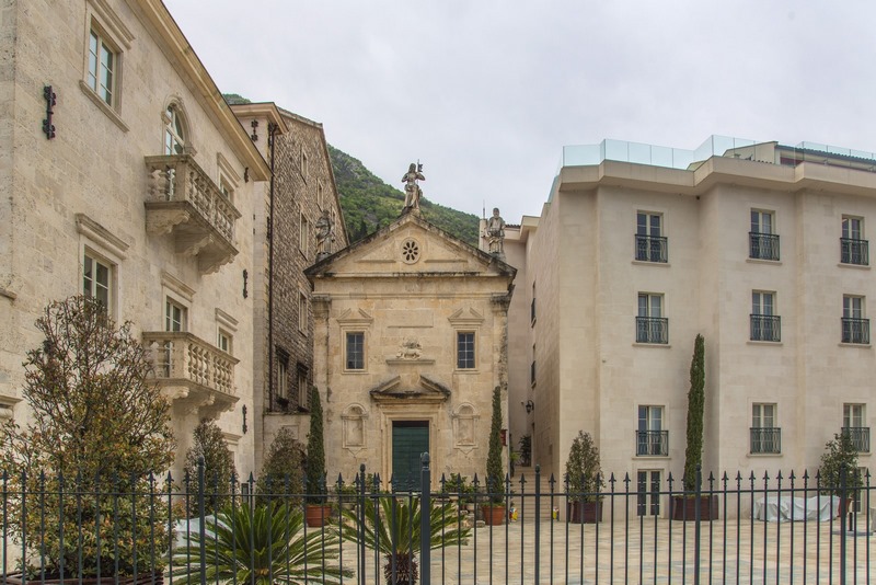 Iglesia de San MarcosOtra iglesia católica que visitar en Perast es la de San Marcos. Es un templo más pequeño, situado en una bonita plaza junto a la bahía, y data del siglo XVIII. En su fachada principal, justo encima de la puerta a la cual se accede por unas escaleras de piedra, verás la escultura del león de San Marcos. Es un edificio de estilo barroco y fue construido en el año 1760. En la parte de arriba destacan tres estatuas: San Pedro, a la izquierda; San Marcos, a la derecha; Jesucristo, en el medio. En el lado derecho de la iglesia puedes ver un bonito rincón lleno de macetas coloridas.