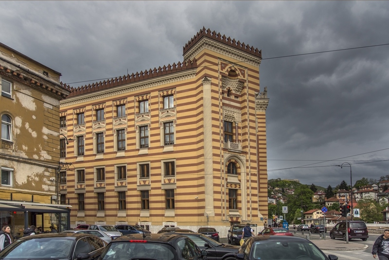 Antigua biblioteca que fue incendiada y destruida por la artillería serbia durante el sitio de la guerra de Bosnia y Herzegovina. Fue reconstruida y reinaugurada como Ayuntamiento en 2014