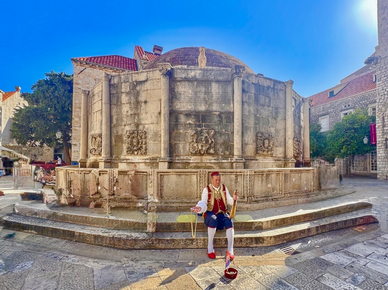 Fuente de Onofrio:Otro lugar que visitar en el centro de Dubrovnik es la bonita Fuente de Onofrio, obra de Onofrio della Cava, el mismo ingeniero que construyó el antiguo acueducto que abastecía de agua a la ciudad. La fuente, de piedra y perfectamente circular, está rodeada por 16 arcos que sostienen una gran cúpula. Cada uno tiene una máscara tallada que parece escupir agua. Además, se encuentra justo al lado de la Puerta de Pile, así que es una de las primeras paradas que encontraréis nada más cruzar a la Ciudad Vieja.