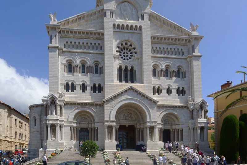 Palacio de Justicia:(Foto Izda) Junto a la famosa catedral de Mónaco, el Palacio de Justicia constituye también una de las curiosidades arquitectónicas del Principado de Mónaco. Su construcción se remonta al año 1924, aunque su arquitectura podría sugerir que se trata un monumento más antiguo. Fue construido a petición de Luis II y su color particular proviene del material utilizado para ello. Se trata en efecto de una piedra especial, la tuf marin, que también se utiliza para construir los terraplenes de la Roca Catedral de Mónaco: (Foto Drcha) Construida en piedras blancas La Turbie, en 1875, este edificio de estilo romano-bizantino alberga las sepulturas de los difuntos Príncipes. De la decoración interior, podemos admirar principalmente un retablo del pintor nizardo Louis Bréa que data del año 1500, del altar mayor y del trono episcopal de mármol blanco de Carrare. Los oficios pontificales tienen lugar allí durante las grandes fiestas litúrgicas bajo los acordes de un gran órgano de cuatro teclados, inaugurado en 1976, cuya magnificencia permite organizar notables conciertos espirituales