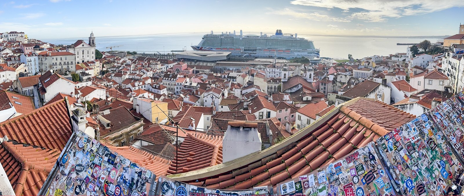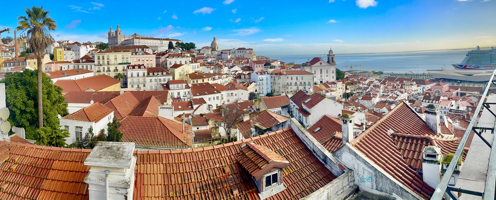 Podemos ver enfrente y a nuestros pies, las casitas blancas de Alfama y el Tajo, donde como es frecuente ver barcos de cruceros que llegan cargados de turistas.