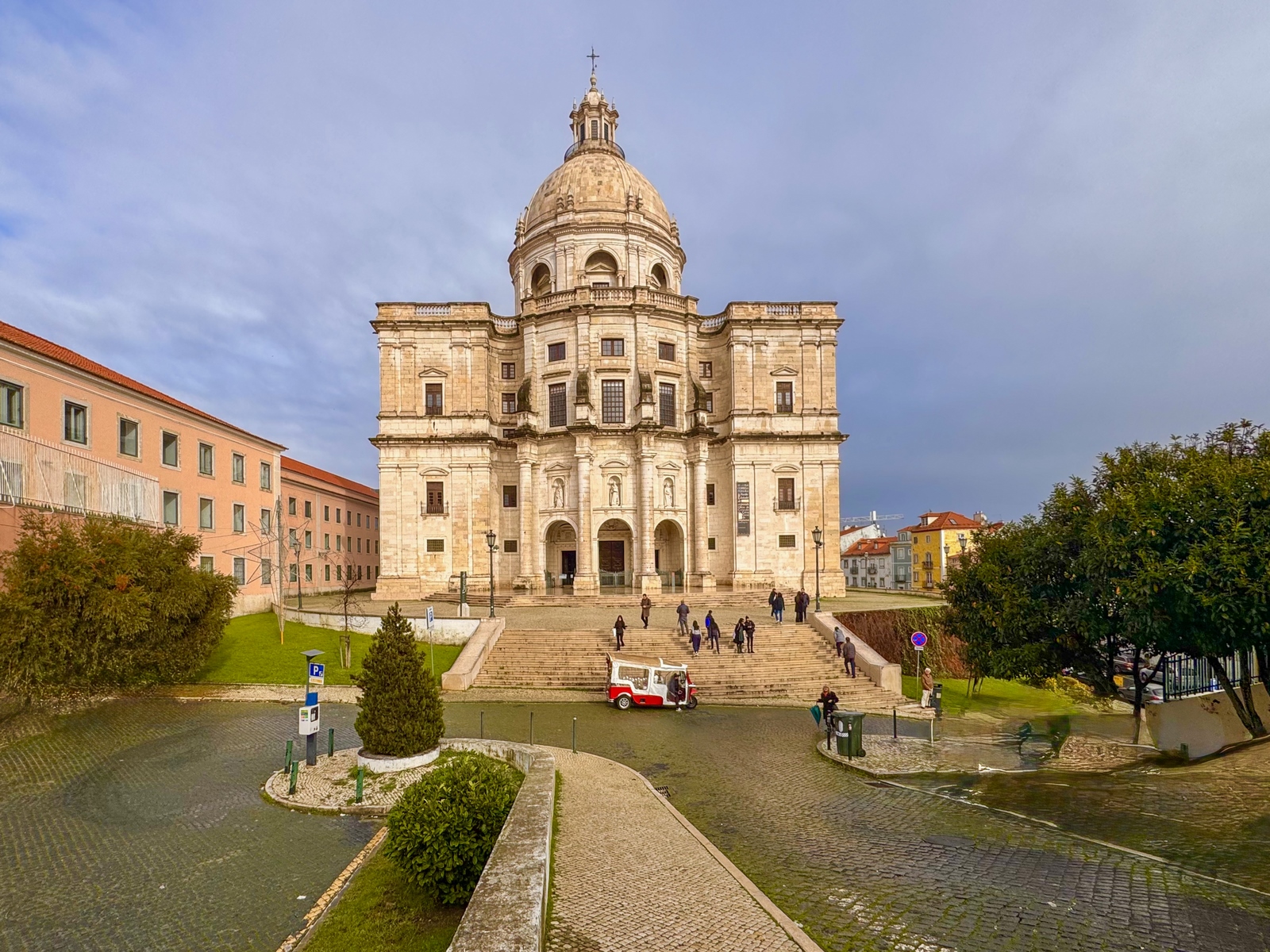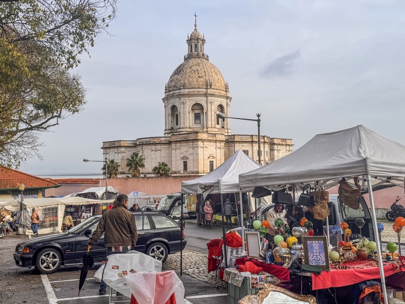 El Panteón Nacional de Lisboa era conocido antaño como Iglesia de Santa Engracia. Esta gran construcción barroca comenzó a construirse a finales del XVII y se terminó del todo… en 1966. De ahí que los portugueses comparen cómicamente cualquier proyecto extendido en el tiempo con las obras de Santa Engracia. En el lugar donde hoy se levanta el Panteón Nacional había, desde el siglo XVI, una iglesia de la que actualmente ya no queda prácticamente nada, pues poco después de ser arrasada por un temporal se colocaron sobre ella las primeras piedras del que sería Panteón Nacional. Desde principios del siglo XX, este imponente edificio ejerce como panteón, siendo lugar de entierro para portugueses célebres como Amália Rodrigues, los presidentes de Portugal, o João de Deus. Además, alberga los cenotafios de otros lusos de prestigio como Vasco de Gama o Luis de Camôes. Detrás se encuentra el mercado da Ladra