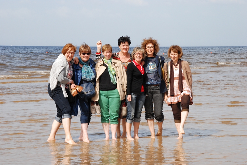 l El agua perfectamente tibia y calmada justo para un buen momento de relajación, la árena con un tono cercano a los blanco nos motiva a pasear un momento y disfrutar de este bello lugar. Las mujeres remojándose los pies y en contacto con el agua. Pero esto no es todo, el agua de Jurmala casi no tiene sal. Curioso.